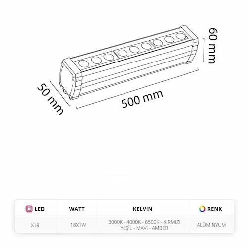18x1W LED Wallwasher Duvar Boyama Armatürü toplam 18 adet yüksek verimli power LED ile üretilmiştir. Bu güçlü LED çipler yüksek ışık performansı sunarken aynı zamanda enerji tasarrufu sağlar. LED teknolojisi sayesinde geleneksel halojen veya metal halide aydınlatma sistemlerine göre çok daha düşük enerji tüketimi ile çalışır.